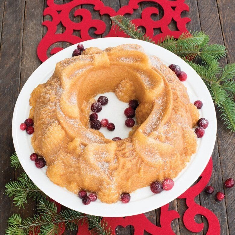 Create a beautiful centerpiece or holiday treat for your next festive gathering. The Holiday Wreath Bundt pan creates a wreath cake sculpted with pine cones, holly leaves, berries and ribbon.